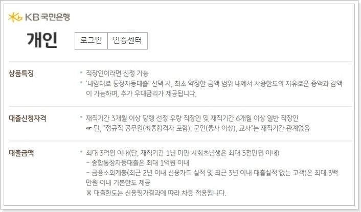 국민은행 마이너스통장을 신청할 수 있는 대표적인 상품이 ‘KB 직장인든든 신용대출’이에요. 이 상품은 직장인을 위한 마이너스통장인데요, 재직기간이 3개월 이상인 우량 직장인이거나, 일반 직장인은 6개월 이상이면 가능해요.